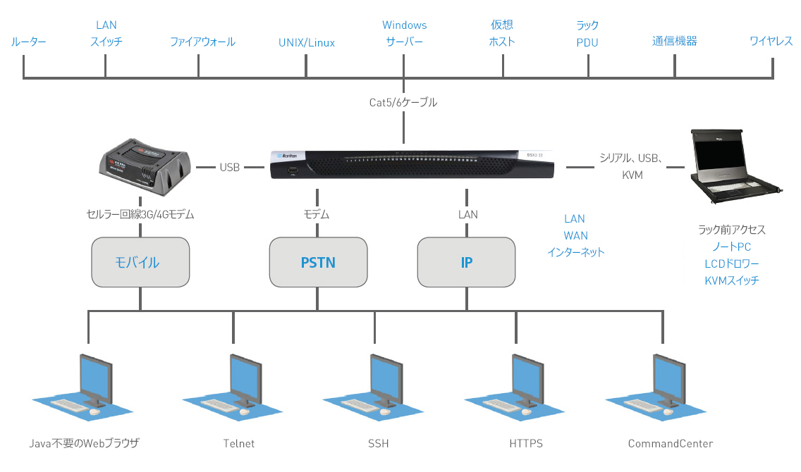 これらのインフラ資源をネットワーク経由で管理・制御することで、サポートに要するコストやスタッフの移動時間などを削減できるほか、障害発生時には、早期の対応から解決までの時間短縮も可能になる。ネットワークの障害発生時も、コマンドラインにより確実に対象機器にアクセスできる。同社のインテリジェントラックPDUを使えば、各デバイスの電源一旦切ってから入れ直すことも可能だ。「CommandCenter Secure Gateway」によりSSO(Single Sign On:シングルサインオン)での統合管理ができる。
