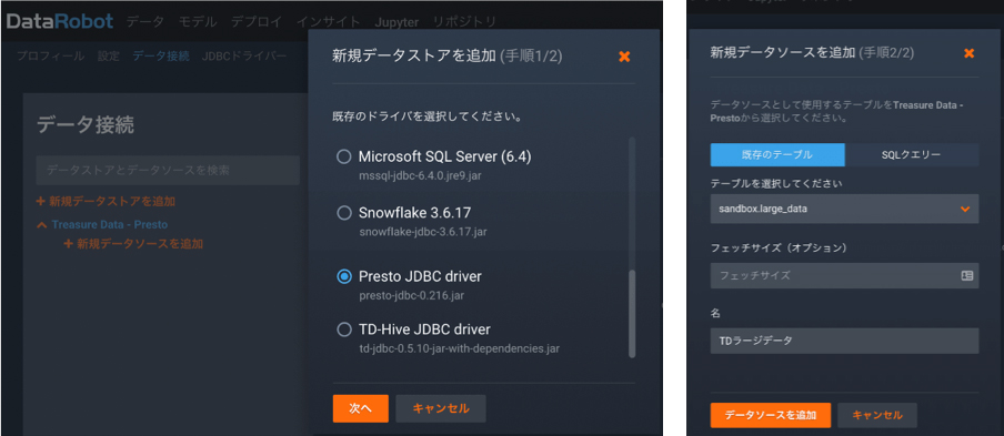 DataRobotのデータソース設定から「Presto JDBC」または「TD-Hive JDBC driver」を選び、Arm Treasure Data eCDPへの接続情報を入力する。こうして、データセットのテーブルをDataRobotに登録する。モデル作成時は、登録したデータセットを選択し、予測対象となる項目を設定するだけでモデルを作成する(画面2)。