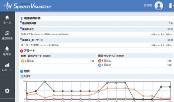 会話をテキスト化する仕組みとして、アドバンスト・メディアのコンタクトセンター向け音声認識ソフト「AmiVoice Communication Suite」を利用する。同ソフトは、オペレーターと顧客との会話を音声認識によってテキスト化する。通話品質をスコア化する機能も備えている。あらかじめ設定したキーワードを含むか、適切なスピードで話しているか、顧客の言葉との間合いは適切か、全体の通話時間は適切か、などを下に通話品質を判定する(画面1)。