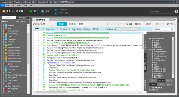 こうした経緯から、RPAソフトウェア「Automation Anywhere Enterprise」(画面1)を導入した。RPA化する作業は2つある。「附属機関の委員等への報酬等の支出資料の作成」作業は、年間で約3000件発生する。「法定調書の作成」作業は、年間で約1500件発生する。現行では、いずれも1件あたり約15分かかっている。