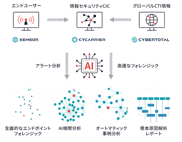 CyCraft AIRで収集したデータは、CyCraftの分析センターに送る。分析センターでは、マルウェアのサンプルやメモリー内のコマンド、シグネチャベースのウイルス対策では分類できない疑わしい振る舞いなどを、AIを用いて調査する。複数の外部データソースを統合して脅威データベースを拡充している。