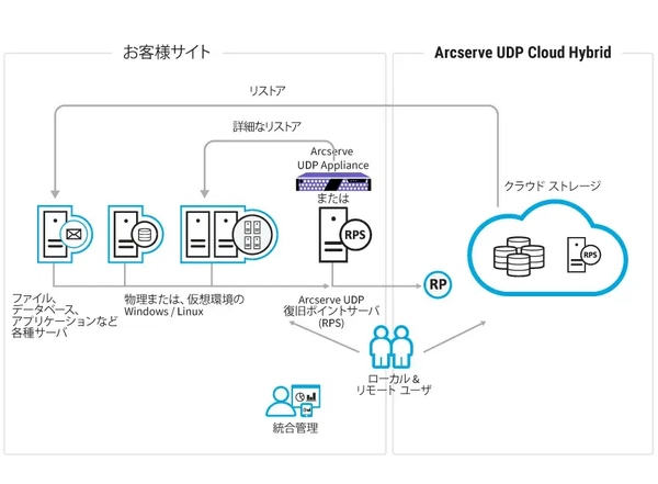 Arcserve UDPのソフトウェアは、バックアップ対象マシン(Windows、Linux)に導入するエージェントソフトウェア、バックアップスケジュールを管理する管理コンソール、バックアップイメージを格納する復旧ポイントサーバーで構成する。ジョブ管理ソフトウェアなどからバックアップ処理を実行できるように、WindowsのPowerShell環境で利用可能なコマンドラインプログラムも提供する。バックアップ済みデータのレプリケーション先となるクラウドサービスとしてArcserve UDP Cloud Hybridも提供している。