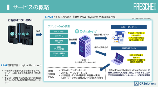 ジーアールソリューションズ(GRS)は2022年6月13日、「IBM i向けアプリケーション資産近代化PoC(Proof of Concept)サービス」を発表した。IBM iアプリケーションをモダナイゼーションする用途に向けて、IBM iアプリケーションを可視化/解析可能なPoC基盤をクラウド上で提供する。稼働中のシステムに影響を与えずに解析が可能である。