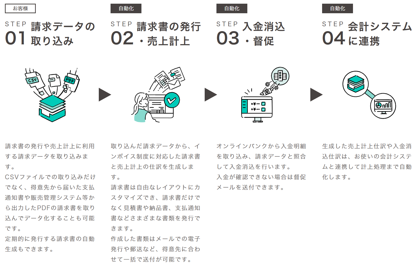 請求書を複数のレイアウトで作成するのが面倒という課題に対し、請求書のレイアウトをカスタマイズできるようにした。こうして作成した請求書の雛形に請求データを取り込むことで、それぞれのレイアウトに合わせた請求書を自動で生成する。生成した請求書は、郵送、メール添付、電子インボイスなど、各種の方法で送付可能である。