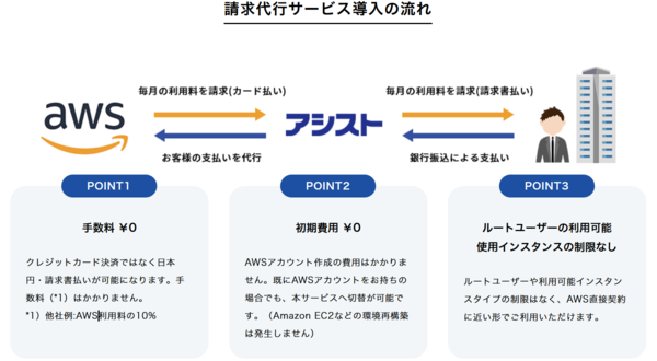 アシストは、AWS利用料の支払いを代行する「AWS請求代行サービス」(図1)を提供している。今回提供を開始した「アシストAWSサポート」は、AWS請求代行サービスに付随するサポートプランの選択肢の1つとして提供する。AWS請求代行サービスを利用しているユーザーで、より多くのサポートを受けたい場合に利用可能である。