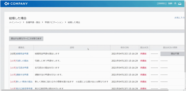 社会保険などの行政手続きについても、行政情報ポータルサイト「e-Gov」と連携することで簡素化した。e-GovとCOMPANYをAPIでデータ連携させ、さらに行政手続きを支援するクラウドサービス「Works Legal Output System」(LOS)を活用するようにした。これにより、申請データの作成、申請、審査状況の確認、公文書取得まで、COMPANY上で完結するようになった。