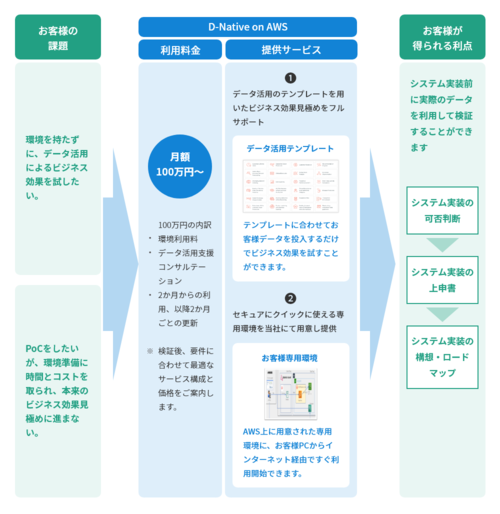 今回のクラウド版「D-Native on AWS」は、エントリーモデルに相当し、テスト利用やPoC(概念実証)を含めた小規模での利用ニーズを満たす。D-Nativeを用いたデータ分析基盤をAWSベースのクラウド「CUVIC on AWS」上に契約後最短2日で用意し、データ活用の支援サービスとあわせて提供する(図1)。