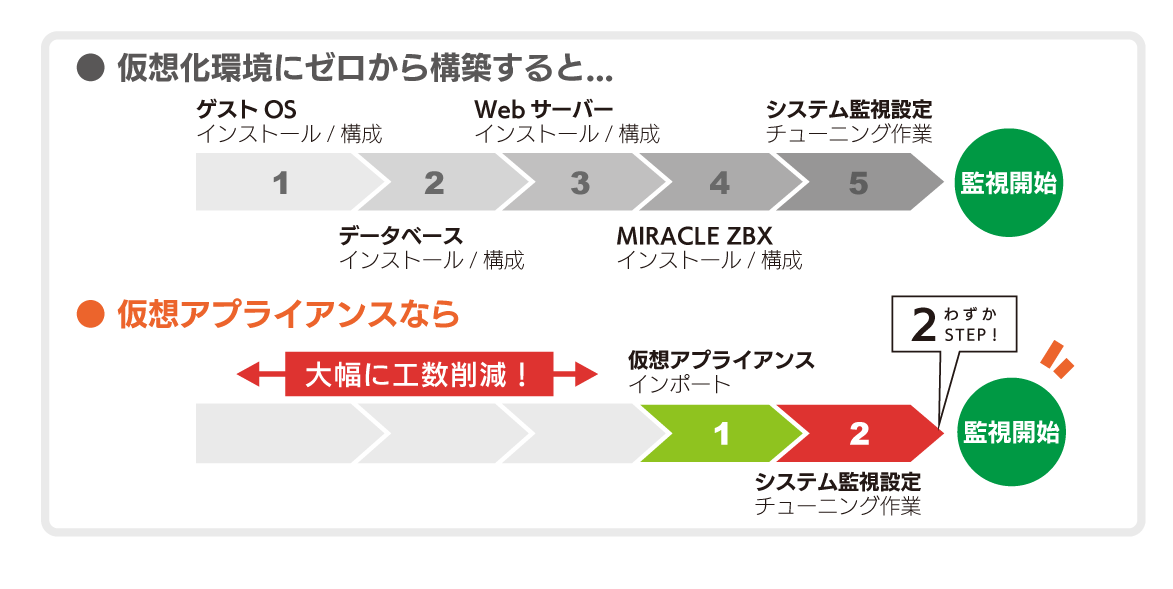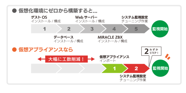 MIRACLE ZBXには、VMware ESXi上で稼働する仮想アプライアンス版「MIRACLE ZBX Virtual Appliance」がある。OS/監視サーバーソフトにMIRACLE LINUXとMIRACLE ZBXを導入したVMware仮想サーバーマシンのイメージを仮想アプライアンスとして製品化したものである(関連記事:仮想環境向けシステム監視「MIRACLE ZBX Virtual Appliance V6.0」、障害検出機能を強化)。