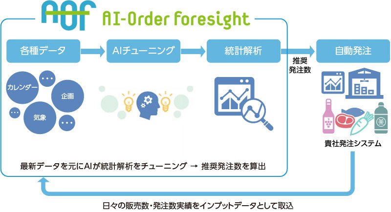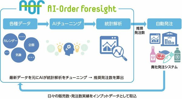 同社が採用したAI-Order-Foresightは、販売実績・気象情報・特売企画情報などの各種データを基に、小売店舗における日々の商品発注数を自動算出する。作業負荷や難易度が高い業務を自動化して、従業員の経験やスキルに依存しない店舗運営や、機会ロスと廃棄ロスの削減を図る。また、従来の自動発注システムは、精度を維持するために予測モデルのチューニングが必要だったが、AIの自動チューニング機能によりメンテナンスフリー運用が可能である。