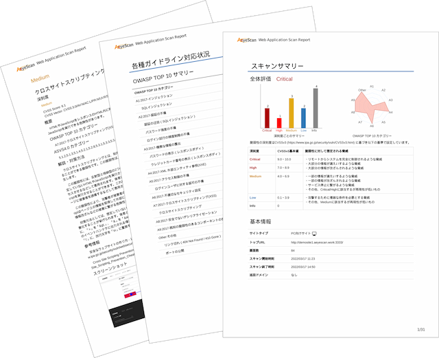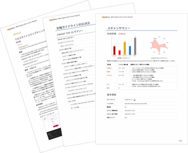 サイバートラストの「AI スキャン診断サービス」は、Webサイトの脆弱性を診断するサービスである。対象のWebアプリケーションに対して疑似的な攻撃を行うことで、情報漏洩やWebサイトの改竄などにつながる脆弱性の有無を確認する。診断対象のWebサイトの規模は問わず、小規模サイトからECサイト、大規模システムのWebサイトまでカバーする。サービスの申し込みから最短3営業日で診断レポート(図1)を納品する。