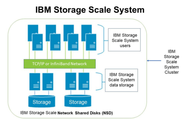 システムの中核となるIBM Storage Scale(旧称:General Parallel File System/IBM Spectrum Scale)は、複数のノードを束ねて単一の仮想的なファイルシステムを構築可能なSDS(ソフトウェア定義型ストレージ)である(図1)。