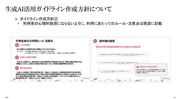 「生成AIを庁内業務や住民サービスに活用することで、職員の働き方改革や住民向けの行政サービスを高度化することが期待されている。生成AIの活用にあたっては、生成AIの特性、導入した場合のメリット、利用する上での注意点などの理解が大事である。また、業務での利用に即したガイドラインの整備が不可欠である」(PwCコンサルティング)