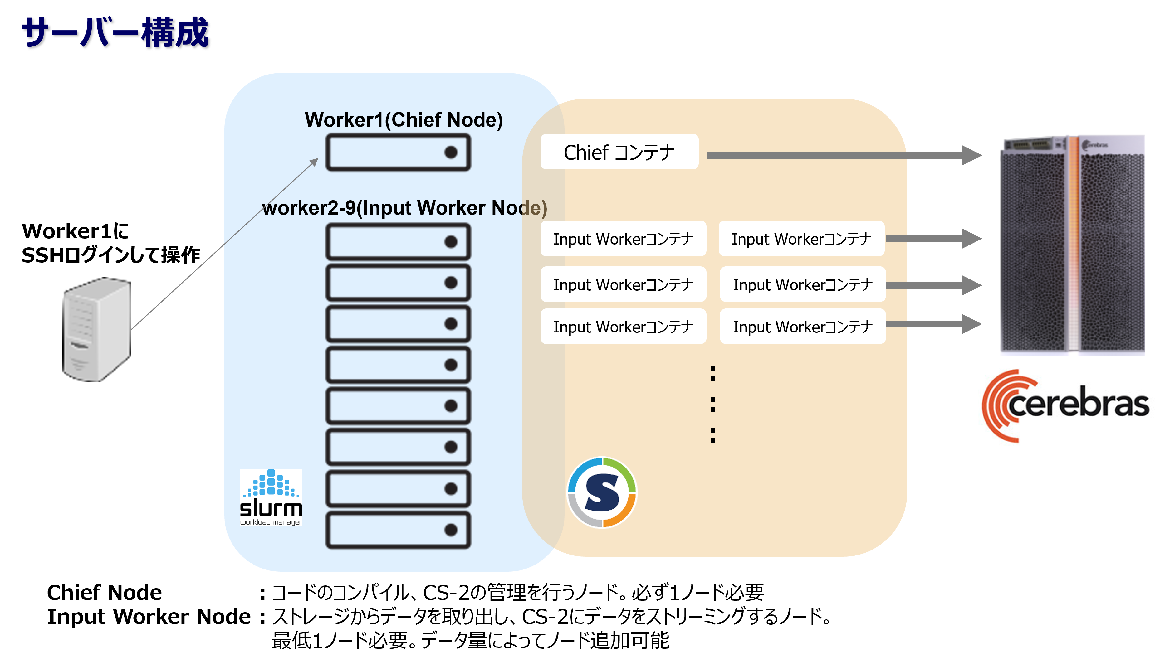 図1:Cerebras Systems(セレブラスシステムズ)のディープラーニング専用ネットワーク接続アクセラレータを用いた計算資源環境(出典:米Cerebras Systems、東京エレクトロン デバイス)拡大画像表示