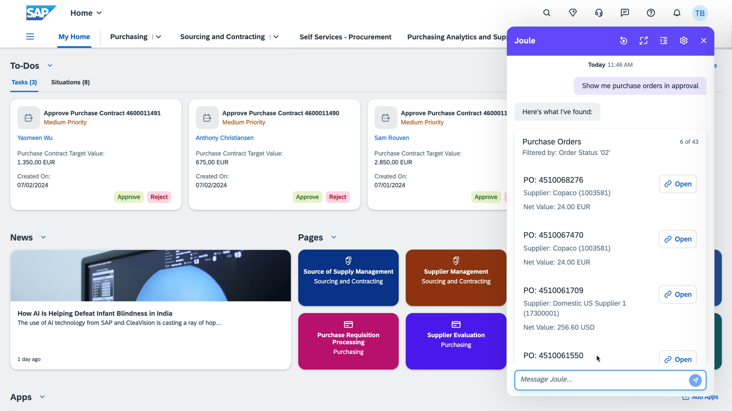 画面1:S/4HANA Cloud Private Editionで動作する「Joule」(出典:SAPジャパン)拡大画像表示