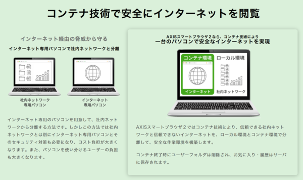 アクシスは2023年10月6日、インターネット分離ソフトウェア「AXISスマートブラウザ2」を提供開始した。Windows PC内に通常の環境とは分離したコンテナ環境を用意する仕組み。コンテナ内のWebブラウザからインターネットにアクセスすることで、不正コードやマルウェアなどの影響がローカル環境に及ばないようにする。価格(税別)は1台あたり月額3980円で、最小構成は5ライセンス。別途、導入支援などの初期費用30万円が必要となる。
