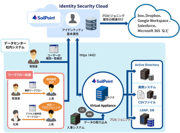 こうした経緯から、SailPointテクノロジーズジャパンのクラウド型ID管理ツール「SailPoint Identity Security Cloud」を導入した。同ツールは、IDのライフサイクル管理やアクセス権の設定などの管理機能に重きを置いている(図1、関連記事:ID管理/アクセス権限管理「SailPoint Identity Security Cloud」で承認フローをカスタマイズ可能に)。