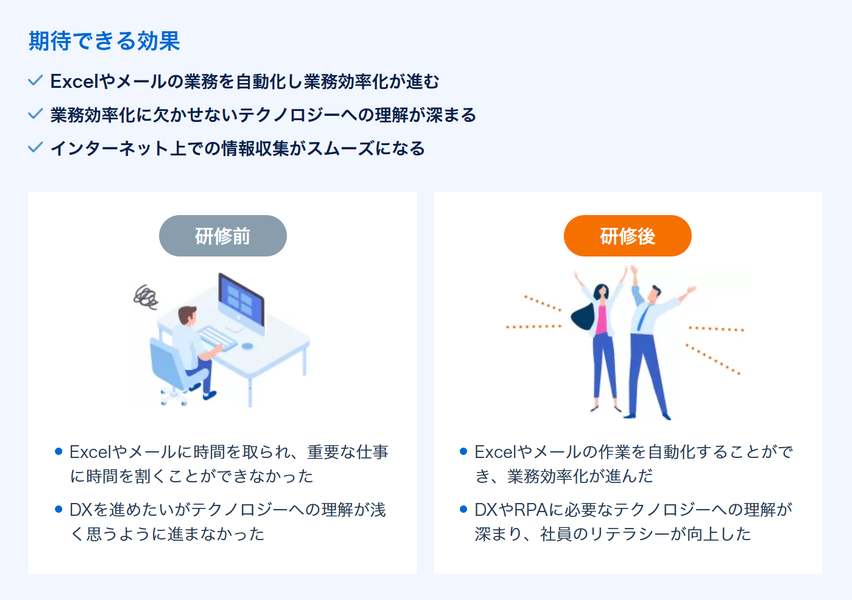 図1:「PythonとExcelとメールソフトを活用した業務の自動化研修」で期待できる効果(出典:インターネット・アカデミー)拡大画像表示