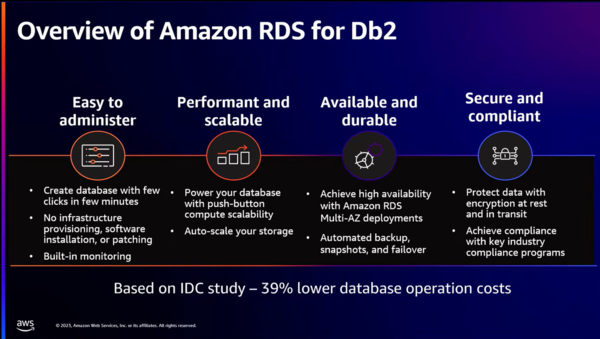米AWSと米IDCがAmazon RDSユーザーを対象に実施した調査によると、マネージドデータベースのAmazon RDSに移行することで、データベース管理者1人あたり約60%多いデータベースを管理できるようになり、データベース運用コストが3年間で39%減る見込みだという。