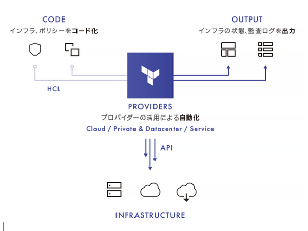 主力製品であるTerraformは、IaCのためのミドルウェアである。クラウド環境で調達するサーバーなどの構成をコード化し、プロビジョニングを自動化する。「どこのクラウドサービスで」「どのようなスペックを持つ仮想サーバーやリソースを使うか」といった指定をコードとして記述し、各クラウドに反映してITリソースを調達する(関連記事:東京エレクトロン デバイス、「Terraform」「Vault」などのHashiCorp運用管理製品を販売)。
