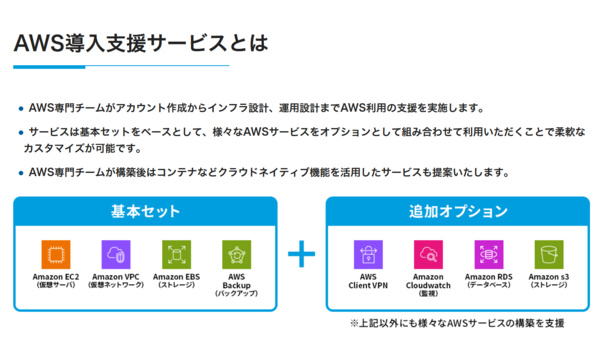 同社のAWS専門チームが、アカウント作成、インフラ設計、運用設計まで、AWSの利用に必要な支援を実施する。サーバー/ネットワーク/ストレージを用意し、バックアップを設定するなど、基本的なクラウドサーバーの立ち上げを基本セットとして提供し、各種AWSサービスの導入・設定をオプションで提供する。