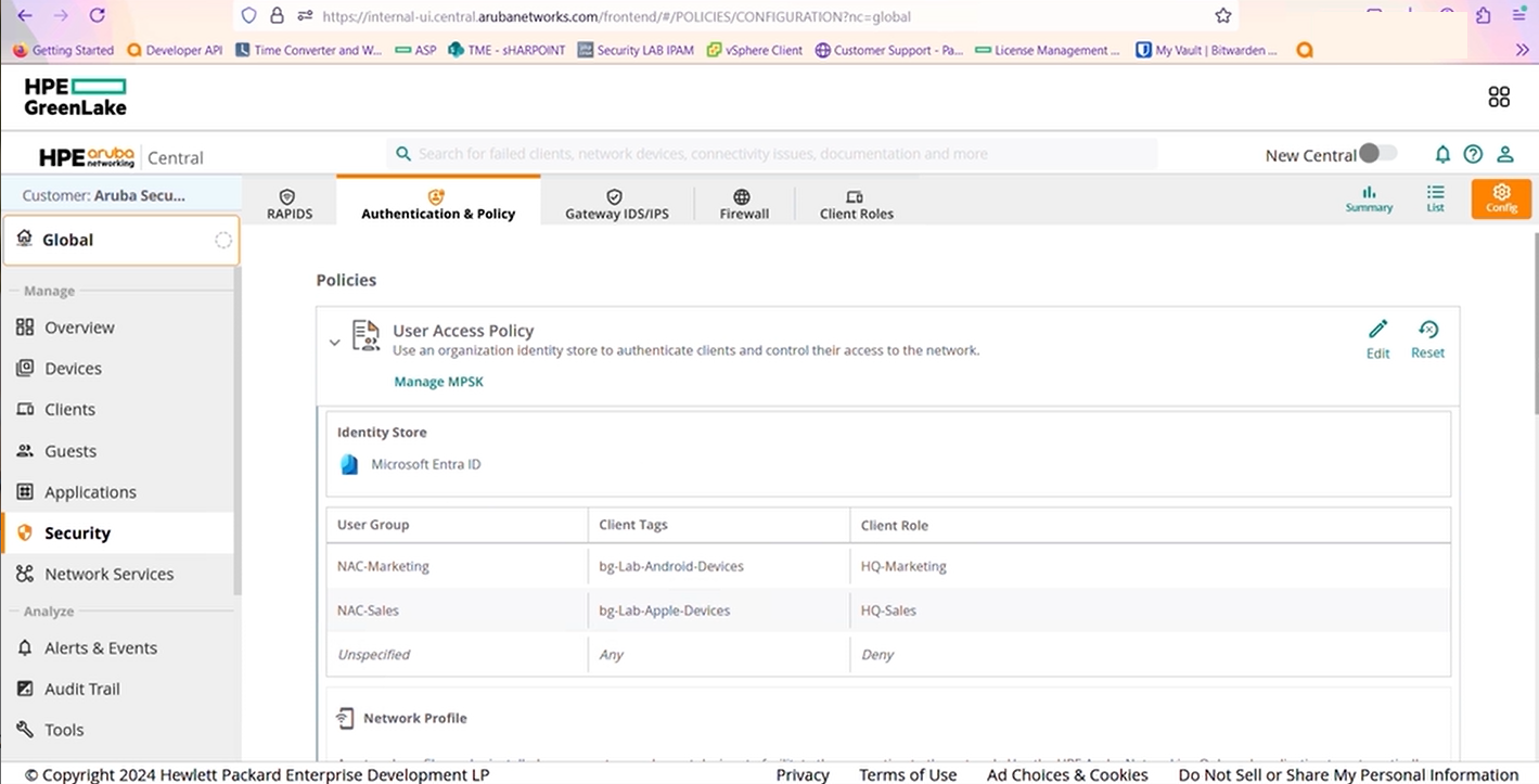 導入したのは、ロール(役割)ベースのユーザー認証/アクセス制御や検疫ネットワーク機能を提供するサーバー製品「HPE Aruba Networking ClearPass」(画面1)である。これをMicrosoft Azure上に設置し、本社と各拠点にHPE Aruba Networkingのアクセススイッチ機器と無線LANアクセスポイントを配備した。