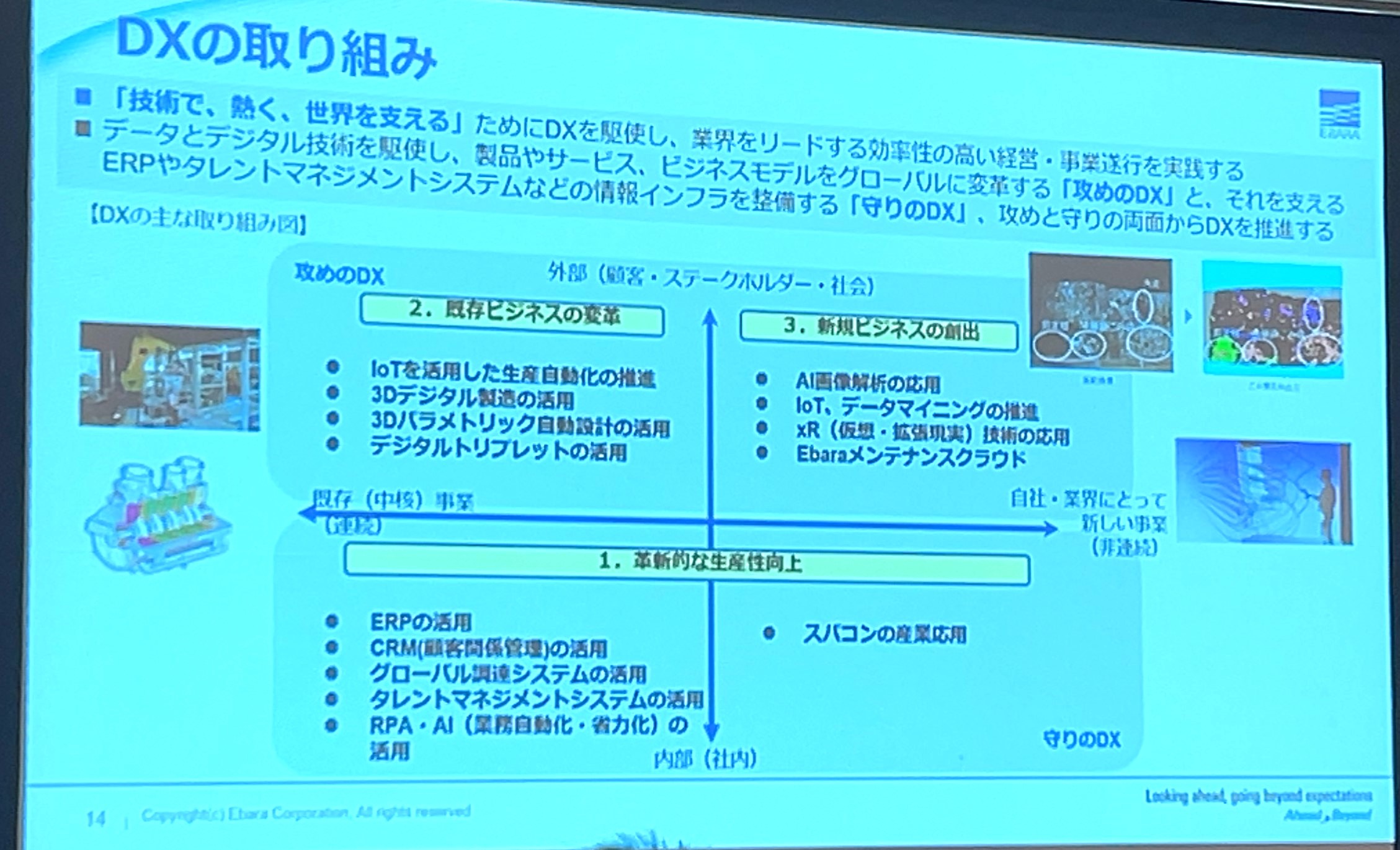 図2は荏原製作所のDXの取り組みをまとめたものだ。新規事業と既存事業、外部と社内、事業主体でビジネスモデルのデジタルシフトを進める「攻めのDX」、主にITインフラの整備に携わる「守りのDX」が4象限マトリクスに示されている。