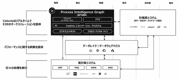 黒枠の部分がCelonisプラットフォームで、PI Graphアーキテクチャの下、部門横断型で機能する。その中にある「プロセスデジタルツイン」は、Celonisが以前より顧客企業に確立を訴えてきた「組織のデジタルツイン(Digital Twin of Organization)」と同義ととらえられる。