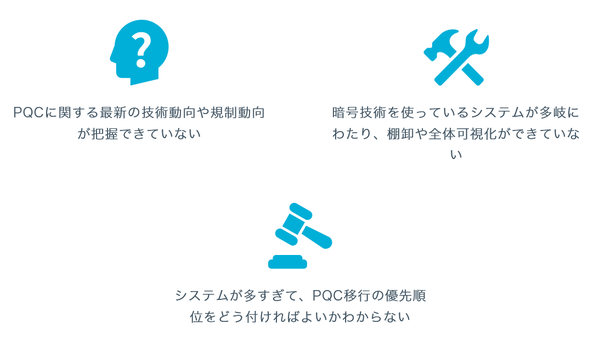 図1にある、企業の典型的な課題に応えるとしている。「現在、多くの企業がデータ保護、電子署名、認証、鍵交換などの用途で暗号技術を利用している。PQCへの移行にあたっては、システムのどの部分に、どのような暗号技術を利用しているかを可視化したうえで、移行の優先度を整理する」(NRIセキュア)。