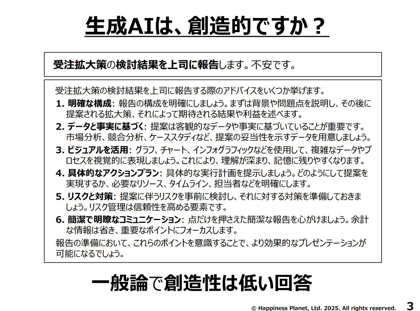 図1:生成AIの回答は創造的か(出典:ハピネスプラネット)拡大画像表示