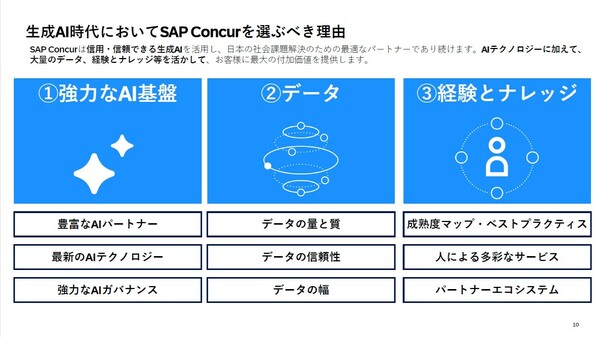 その根拠として、SAPが開発する高度なAI基盤・サービスとの連携や、年間10億件の経費明細や3000万件の出張データなどを含む、グローバルで1億人に上るユーザーが生むビッグデータを挙げた。豊富な支援実績から来るナレッジ、パートナーエコシステムも強みであるとアピールしている(図2)。