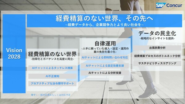 写真1:コンカー 代表取締役社長のの橋本祥生氏そんな同社が掲げる新ビジョン「Vision2028」では、(1)自動化や効率化による経費精算のない世界の実現に加えて、(2)サービスの設定や運用の自律化、(3)戦略的な洞察を得るためのデータの民主化、の3点に注力している(図1)。