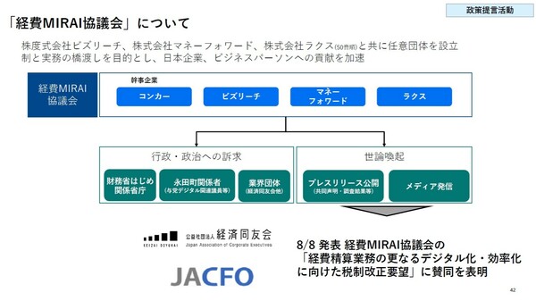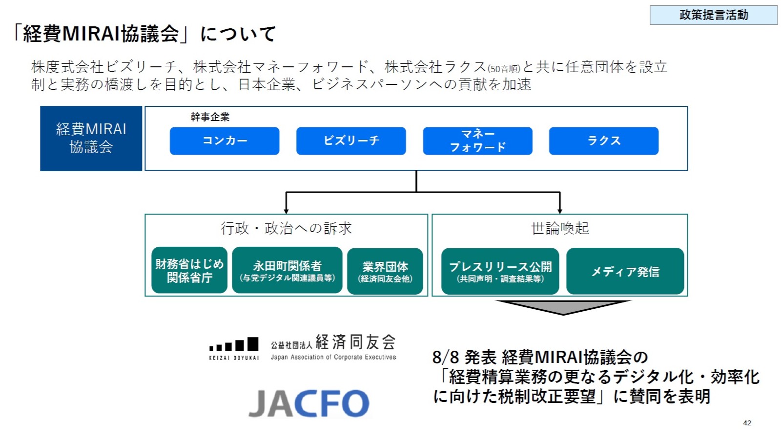 政策提言活動に関しては、経費精算業務をめぐる制度と実務の橋渡しを目的に、2025年6月に任意団体「経費MIRAI協議会」を設立し、行政・政治への訴求や世論喚起のための活動を行っている。コンカーは幹事企業で、ビズリーチ、マネーフォワード、ラクスが参画する。同年8月にはインボイス制度に関する税制改正要望を発表している(図4)。