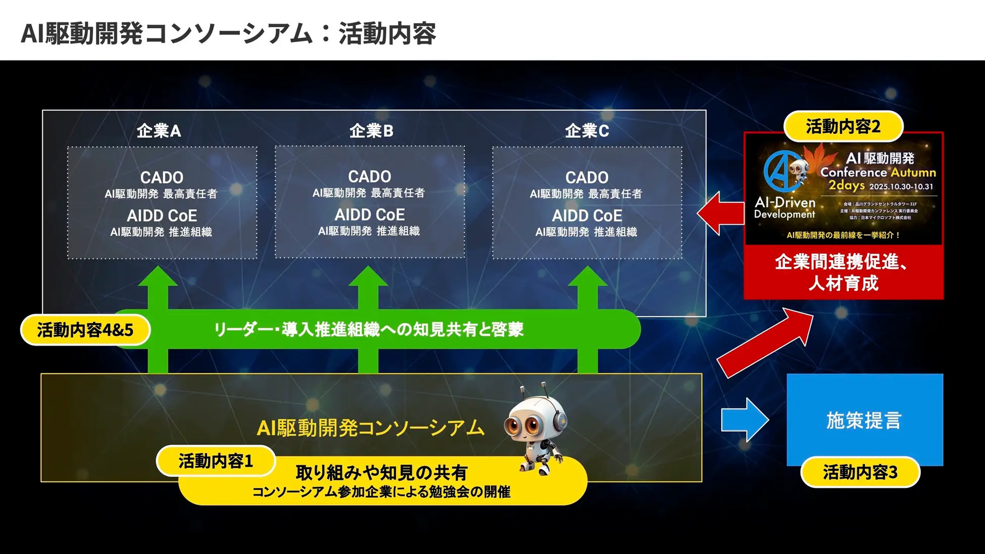 これらのほか、ユーザー企業向けの勉強会や「AI駆動開発カンファレンス」などのイベントを実施する。事例、技術トレンド、導入プロセス、開発組織変革などの知見を共有し、企業間での学び合いの促進に努める。