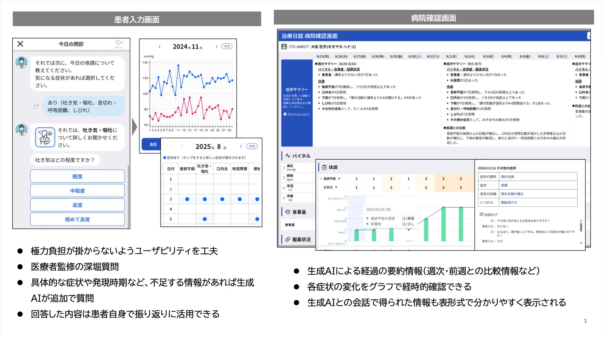「問診生成AI」では、患者がスマートフォンやタブレットなどで、AIアバターが現れるチャットアプリから日々の健康状態を入力する。副作用などで文字入力が困難な場合のために音声入力にも対応している。生成AIによるAIアバターとの会話を通じて、規定の入力項目だけでなく、追加の症状などの情報も引き出せる仕組み。医師や看護師は、入力された情報を電子カルテ端末で参照できる(画面1)。