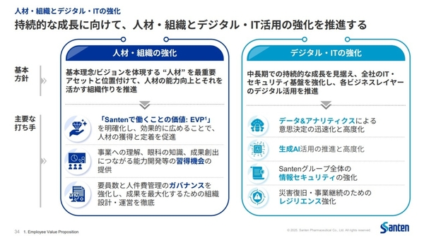 参天製薬では、2025年5月発表の中期経営計画(2025~2029年度)において、事業基盤の継続強化のための施策に「人材・組織とデジタル・ITの強化」を掲げている。主要な打ち手の1つとするのが、生成AI活用の推進や高度化だ(図1)。