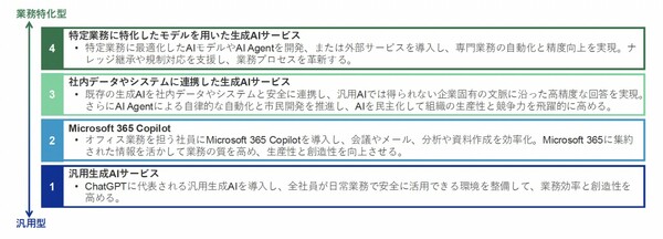 生成AIの導入は、4つの戦略的な枠組みの下で段階的に推進している(図2)。今回のMicrosoft 365 Copilotの導入は、第1段階である社内向け生成AIツール「Santen AI Chat」に続く第2段階にあたる。「今後は、AIエージェントや特定業務に特化したモデルなど、各従業員の職種ニーズに特化したサービスを実装していく」(同社)。