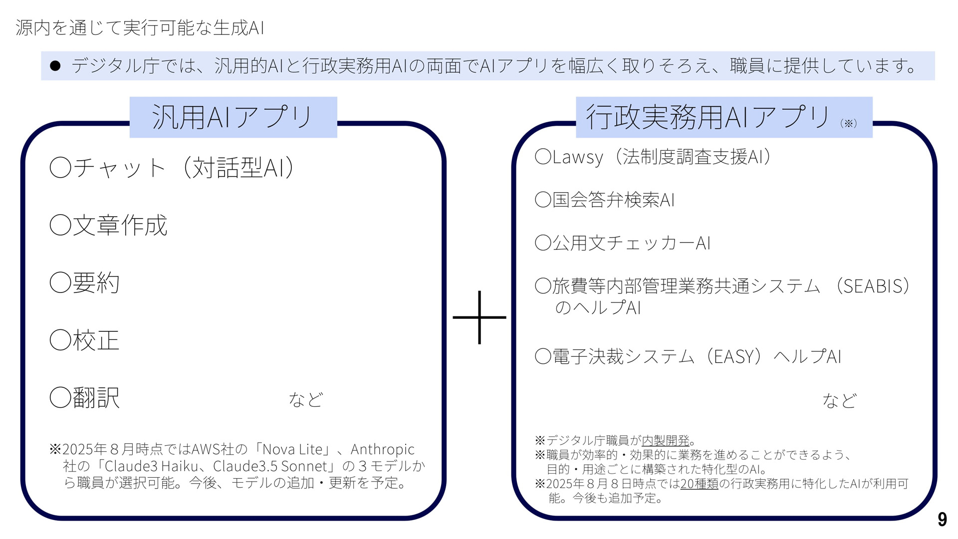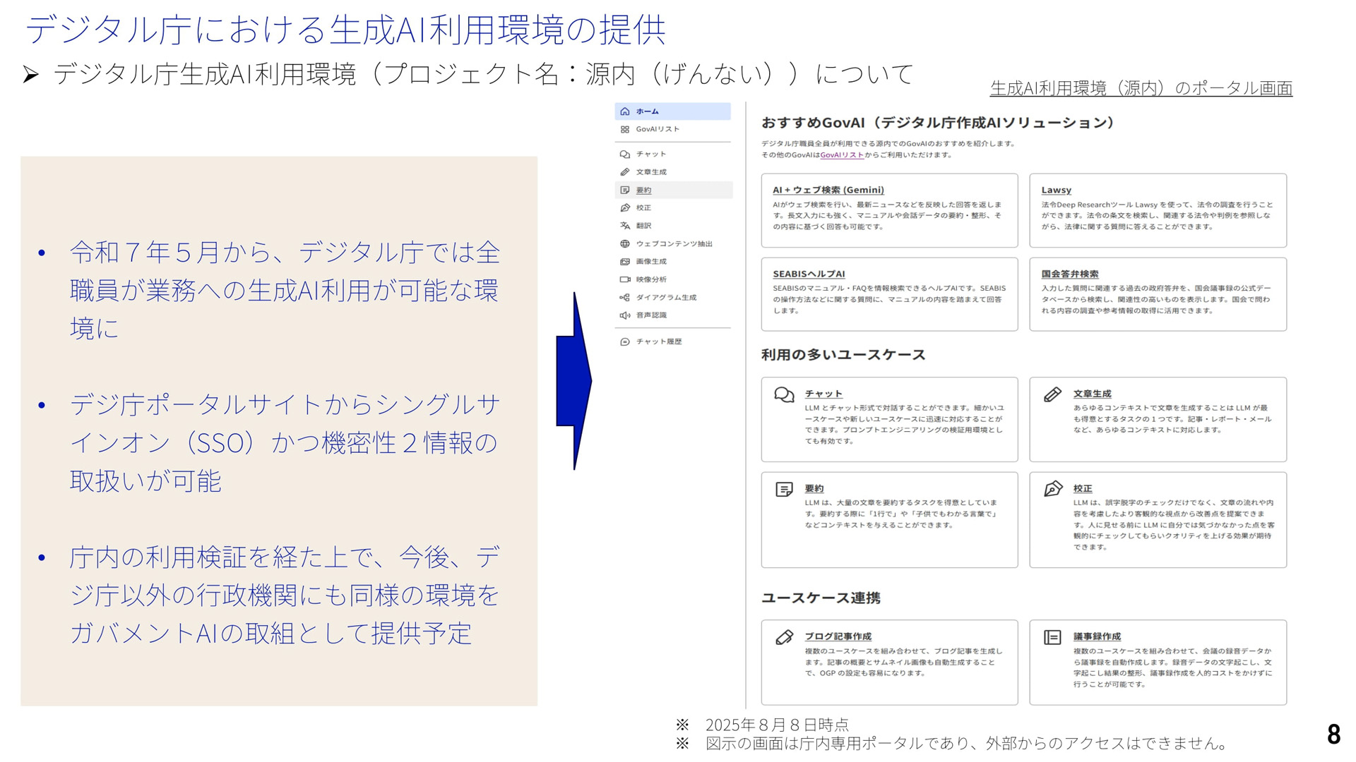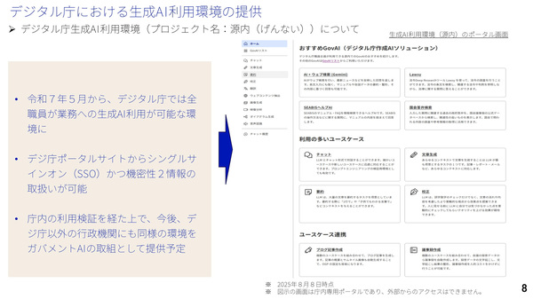 デジタル庁は現在、内製開発による政府のAI基盤「ガバメントAI」の具体化に向けて、源内の各府省庁への展開を進めている。情報システムのセキュリティを確保したうえで、源内を利用する府省庁が業務で活用できるように取り組んでいく。