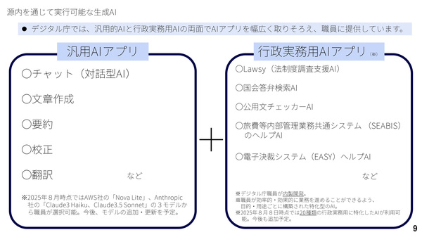 デジタル庁は、全職員が利用できる生成AI利用環境(プロジェクト名:源内(げんない))を内製開発し、2025年5月から運用している。「国会答弁検索AI」や「法制度調査支援AI」など、行政実務を支援する複数のアプリケーションを提供している(図1)。