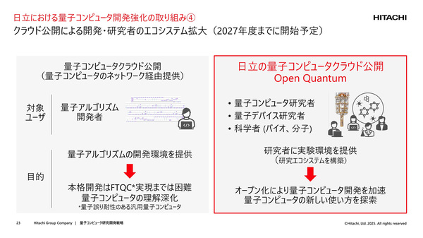 日立は、開発者や研究者が参加するための研究開発基盤として、2027年までにシリコン量子コンピュータの試作機をクラウドに公開する(図2)。インターネットを経由して量子ビットを実際に操作できるようにする。2028年には100量子ビット、2030年には1000量子ビットの試作機を開発する予定である。