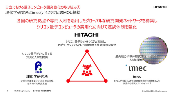 日立製作所は、大規模集積シリコン量子コンピュータの研究開発を、理化学研究所(理研)と進めてきた。半導体の国際共同研究機関であるimecとも連携してきた。今回、各国の研究拠点や人材を活用した研究開発ネットワークの構築に向けた基本合意書(MOU)を3者間で締結した(図1)。