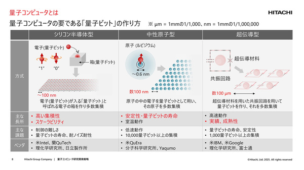 現在、複数の方式で量子コンピュータの開発が進んでいる(図3)。日立が研究開発を進めるシリコン量子コンピュータは、半導体技術を活用し、量子ビットをシリコン基板上に集積する。成熟技術の半導体技術を活用できるため、量子ビットの大規模集積化に有利だとしている。