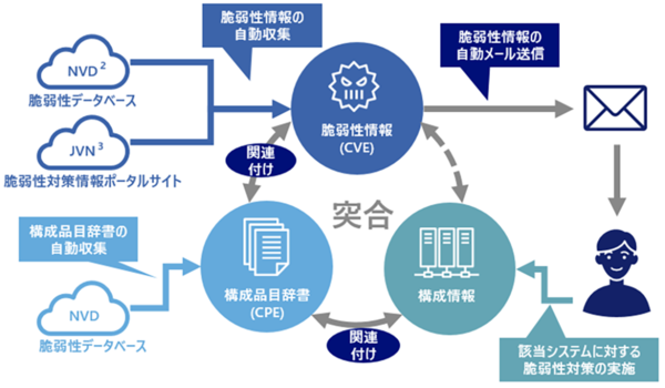 新版の「Senju Family 2025」では、セキュリティ部門が管理するシステム脆弱性情報と、システム運用部門が管理する構成情報との自動突合機能を強化した。構成品目辞書と構成情報をあらかじめ関連付けて、脆弱性情報と自動で突合する(図1)。