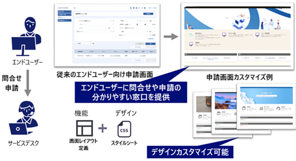 新版ではまた、システムを利用するエンドユーザー向けのポータル機能を拡充した。ポータル画面をカスタマイズし、エンドユーザーに対して、問い合わせや申請時のための分かりやすい窓口を提供できるようにした(図2)。