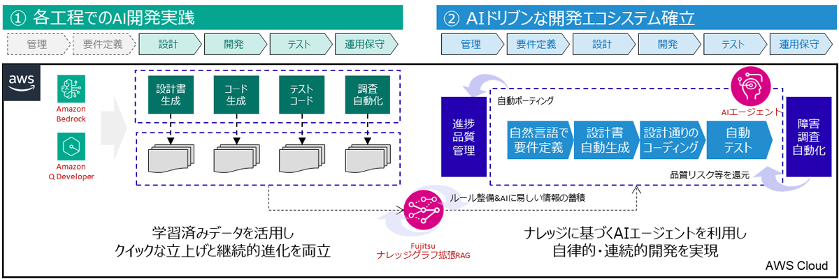 2025年9月、勘定系システムにおいて新機能を開発する際のアプローチを改善し、生成AIの適用を開始した(図1)。社内のナレッジを活用するRAG(検索拡張生成)型のAIシステムを使う。まずは開発・テスト領域を対象に生成AIを適用し、2026年4月までに勘定系システムの全開発に生成AIを適用する。これにより、開発期間を20%短縮する目論見である。