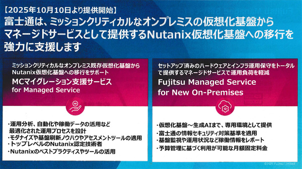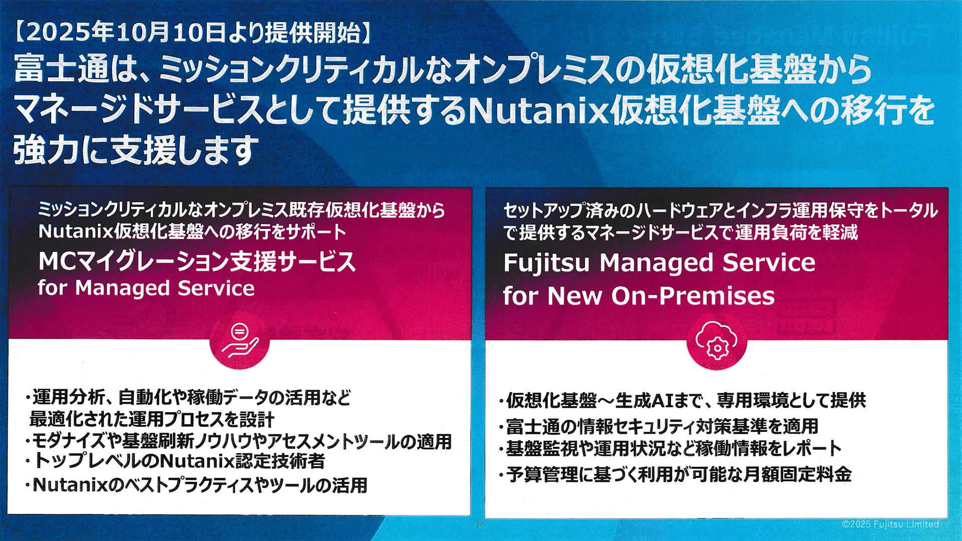 富士通は2025年10月10日、Nutanix仮想化基盤ホスティングサービス「Fujitsu Managed Service for New On-Premises」を提供開始した。富士通のデータセンターにユーザー専有型のNutanix仮想化基盤を設置し、月額固定料金で提供する。また、既存の仮想環境から同環境へと移行するサービスも提供開始した。