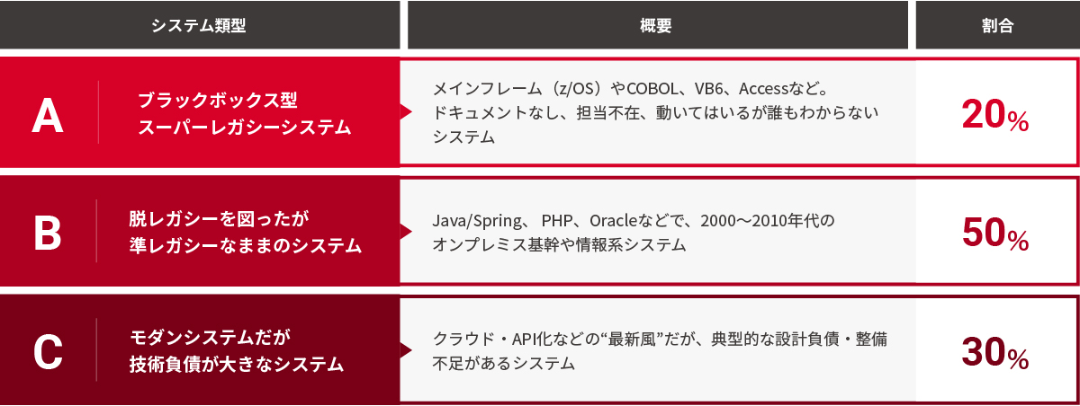 移行/モダナイゼーションの対象について、メインフレーム/COBOLなどの典型的なレガシーシステムだけでなく、運用開始から10年ほど経ったシステムや、モダナイゼーションを施したものの技術的負債が大きなシステムも該当する(図2)。「システムの可視化が困難なことなどから、これらのシステムが塩漬けとなるケースがあった」(SHIFT)。