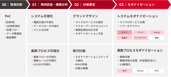 可視化の対象はシステムの機能仕様、データフロー、業務フローなどに及び、これを基にマイクロサービス化を設計する。ソフトウェアを業務プロセスや機能ごとに分割し、複数の独立した小規模サービスの集合体として再構成し、拡張性が高く開発・再刷新しやすいシステムを実現するとしている。