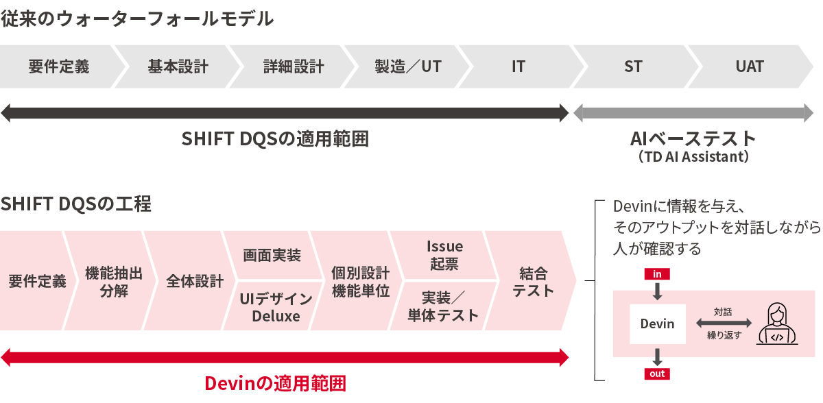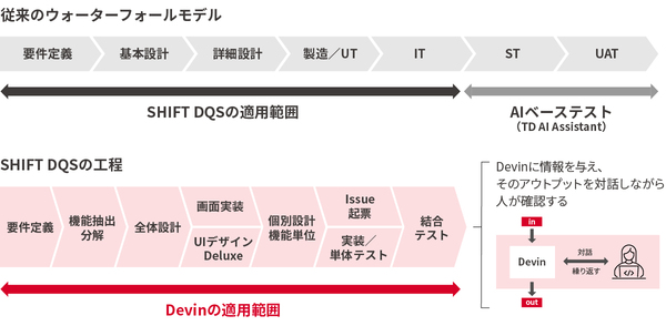 加えて、システム開発フレームワーク「SHIFT DQS(Development Quality Standard)」をAI駆動開発に適した形にチューニングし、米Cognition AIのソフトバンク開発AIエージェント「Devin」と組み合わせて活用する。AIの活用により、システムの要件定義からテスト工程まで、開発工程全体にわたって品質と生産性を高められる環境を整備するとしている(図3)