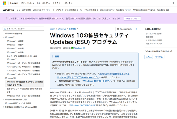 従業員が使うPCのWindows 11への移行にまだ時間を要する企業・組織に向けて、マイクロソフトは有料の「拡張セキュリティ更新(ESU)プログラム」(画面1)を用意している。同プログラムを契約することで、2026年10月13日までは、既存のWindows 10において「緊急」および「重要」に分類されるセキュリティ更新パッチを提供する。ESUには新機能や機能拡張のパッチや技術サポートは含まれず、1年間の暫定的な措置となっている。