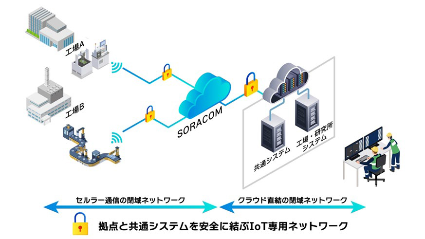 そこで、各現場が蓄積した操業データを安全な方法で全社的に活用可能にするために、IoT共通基盤を構築した。ソラコムが提供する、測定機器などからモバイル通信の閉域ネットワークを経由してクラウド上の共通システムや工場・研究所システムに接続する仕組みをとる(図1)。